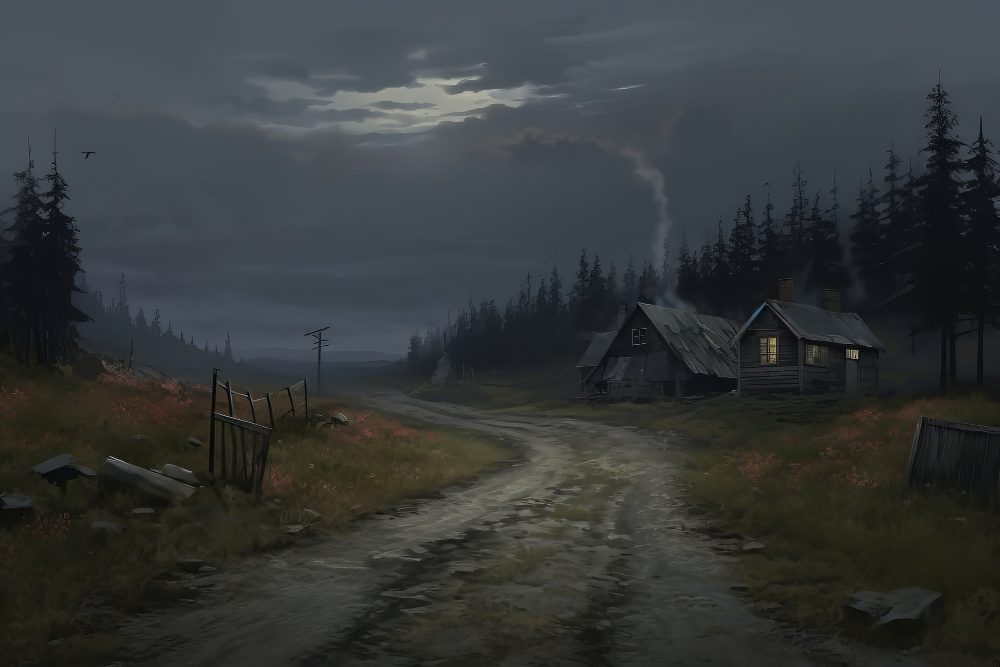 Вокруг были только лишь покосившиеся старые избы. Серыми тучами затянутое небо выдавало моросящий дождь. Жилым выглядел только один дом на краю елового леса.