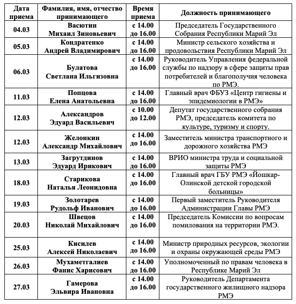 В марте 2025 года жители Марий Эл смогут лично обратиться к чиновникам на прием в Общественно-политическом центре республики.