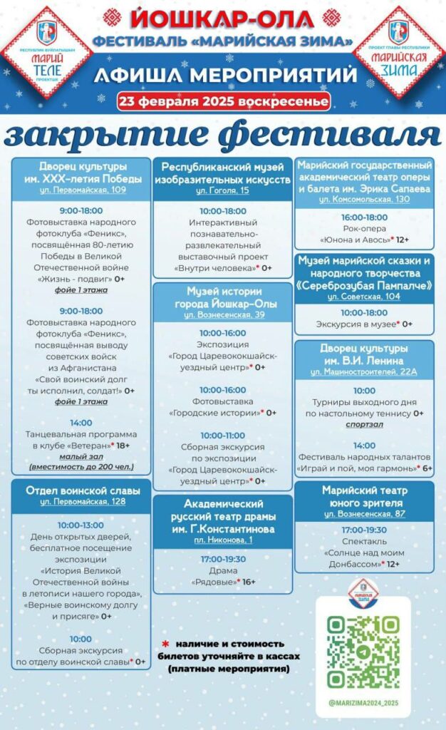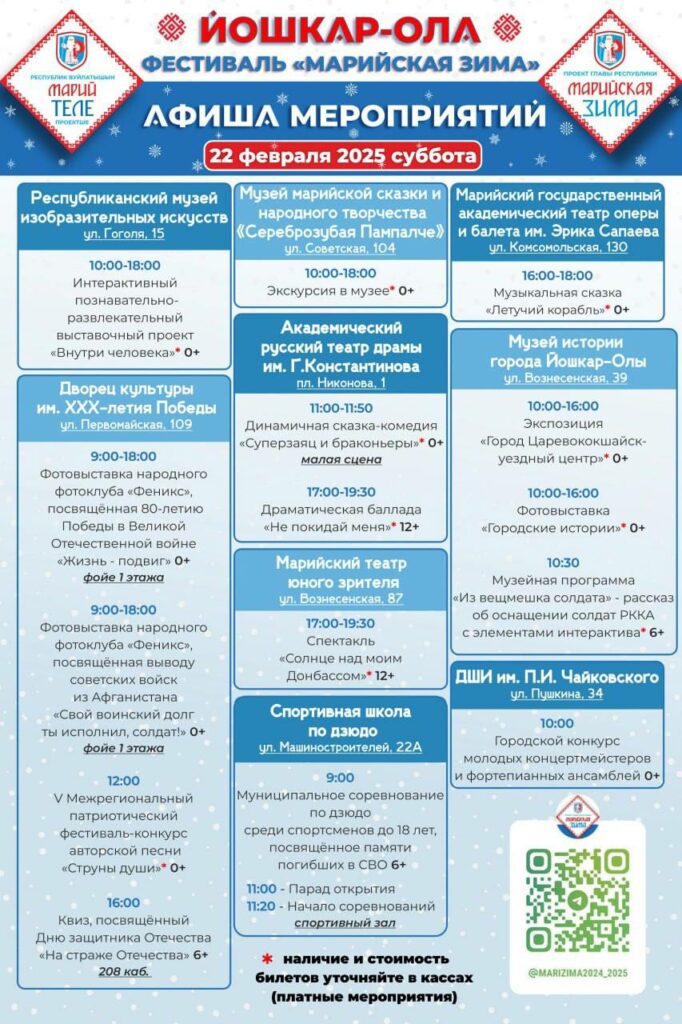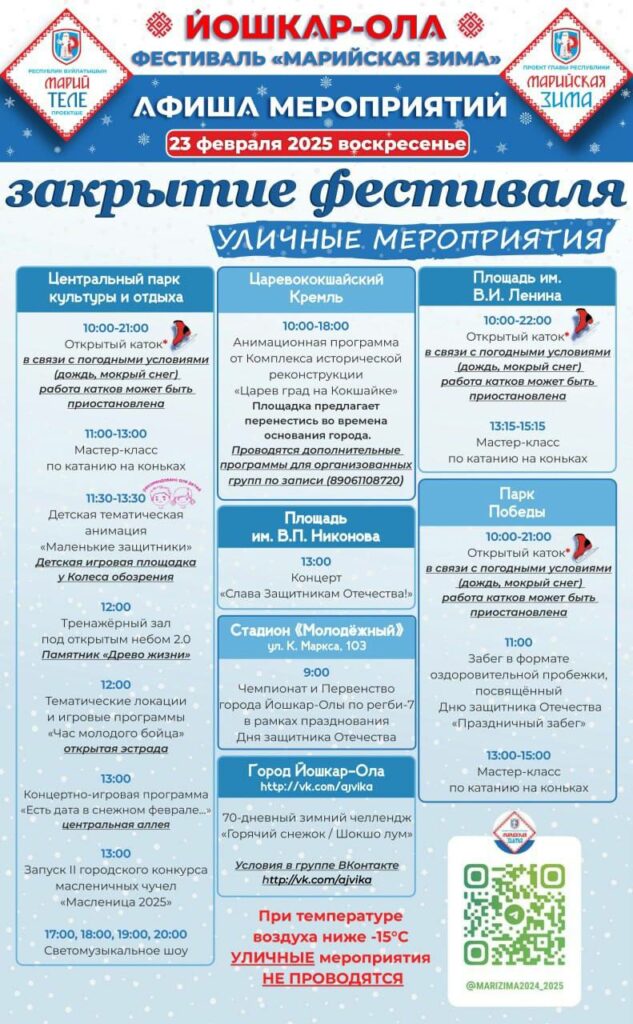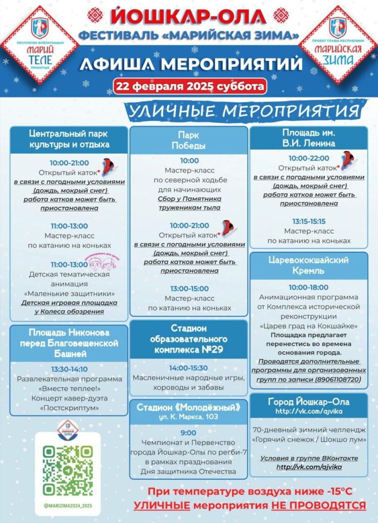 Мэрия Йошкар-Олы анонсировала актуальную программу фестиваля «Марийская зима», который пройдет в предстоящие выходные с 22 по 23 февраля.