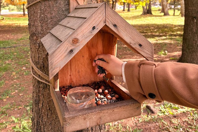 Для удобства посетителей в парке установлены две специальные автокормушки. Вендинговые аппараты выдают кедровые или лесные орехи, а желающие могут принести подходящий корм с собой.