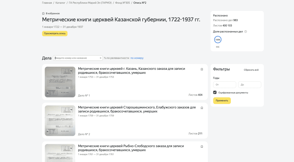 В коллекцию сервиса «Поиск по архивам» вошло более полумиллиона новых сканов, включая полностью оцифрованный фонд 305 опись 2 Государственного архива Республики Марий Эл. В нём содержатся метрические книги по территориям бывшей Казанской губернии, где сегодня располагаются Йошкар-Ола и другие населённые пункты региона.