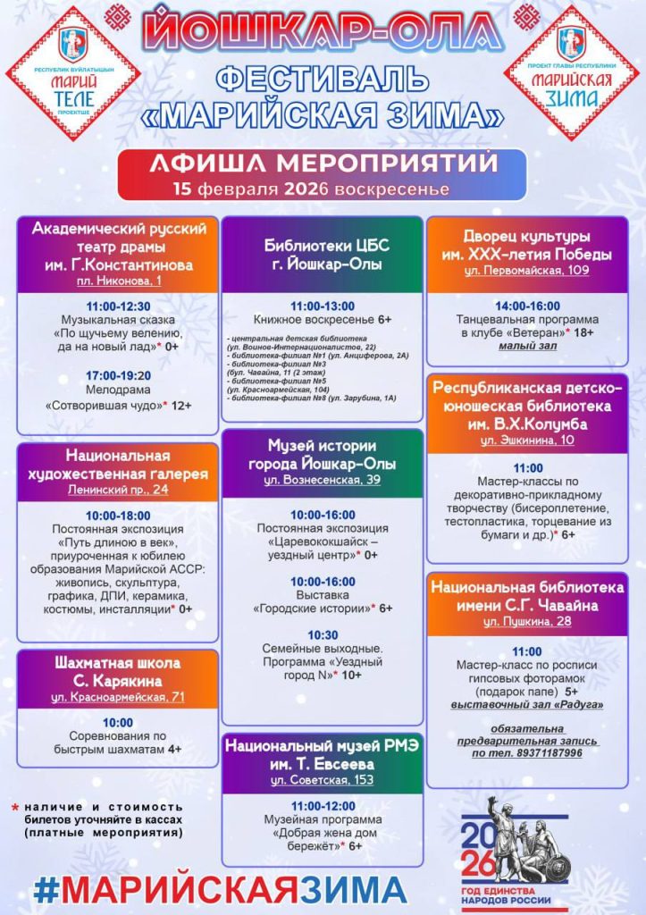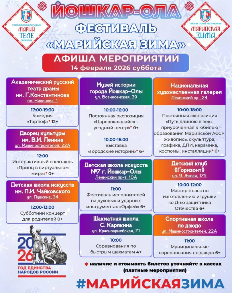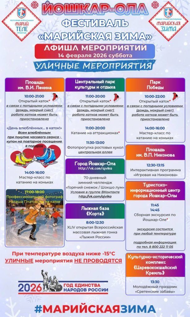 Жители и гости Йошкар-Олы могут посетить развлекательные мероприятия в Йошкар-Оле на выходных 14 и 15 февраля в рамках фестиваля «Марийская зима».