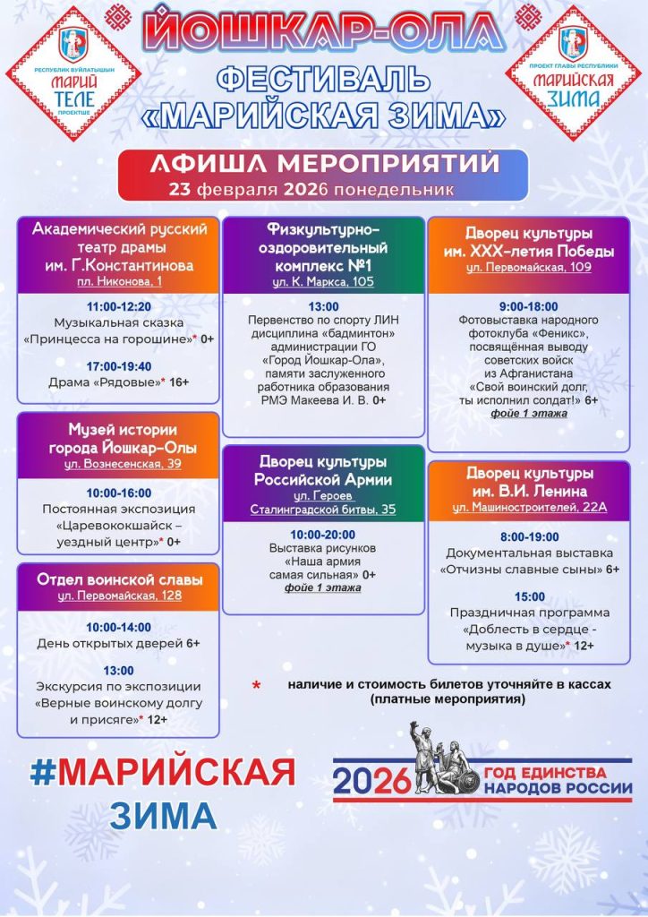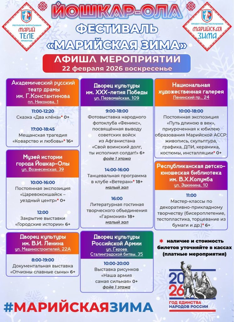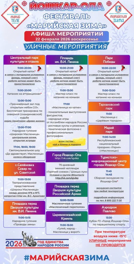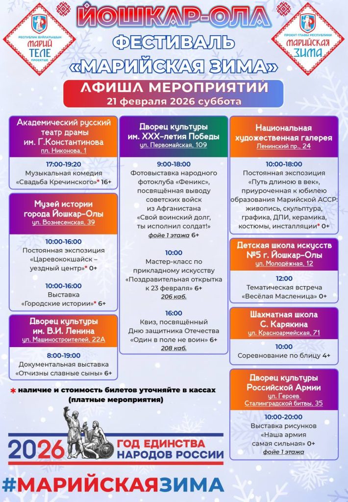 Опубликована афиша фестиваля «Марийская зима», который пройдет с 21 по 23 февраля в Йошкар-Оле.