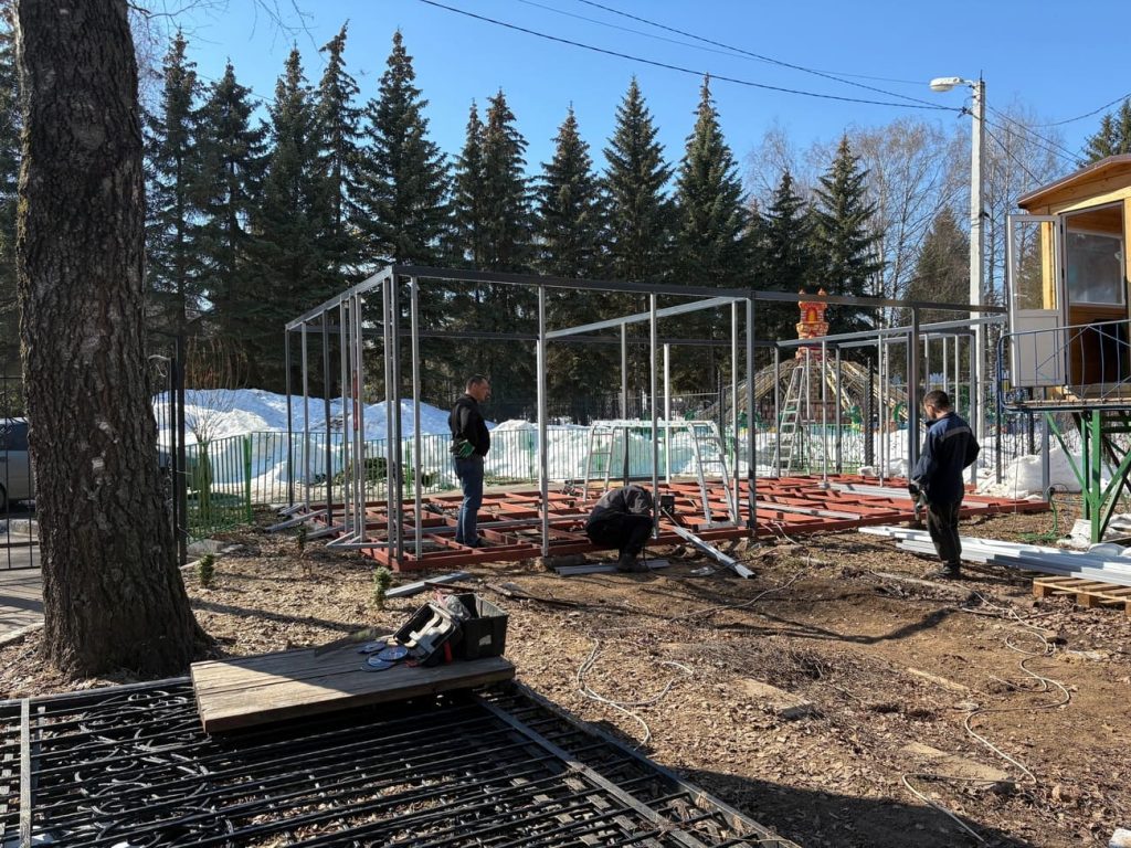 Сотрудники парка демонтируют фонтан рядом с зоной аттракционов, обновляют крыши киосков по продаже билетов и покраску аттракционов, приводят в порядок скамьи.