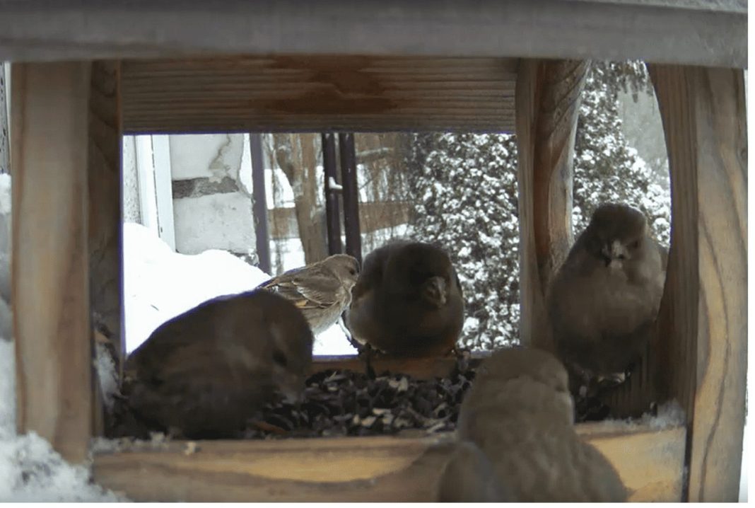 Непогода привлекла на кормушки в Ботаническом саду стайки голодных зеленушек, которые устроили шумные баталии в конкурентной борьбе за пищу.