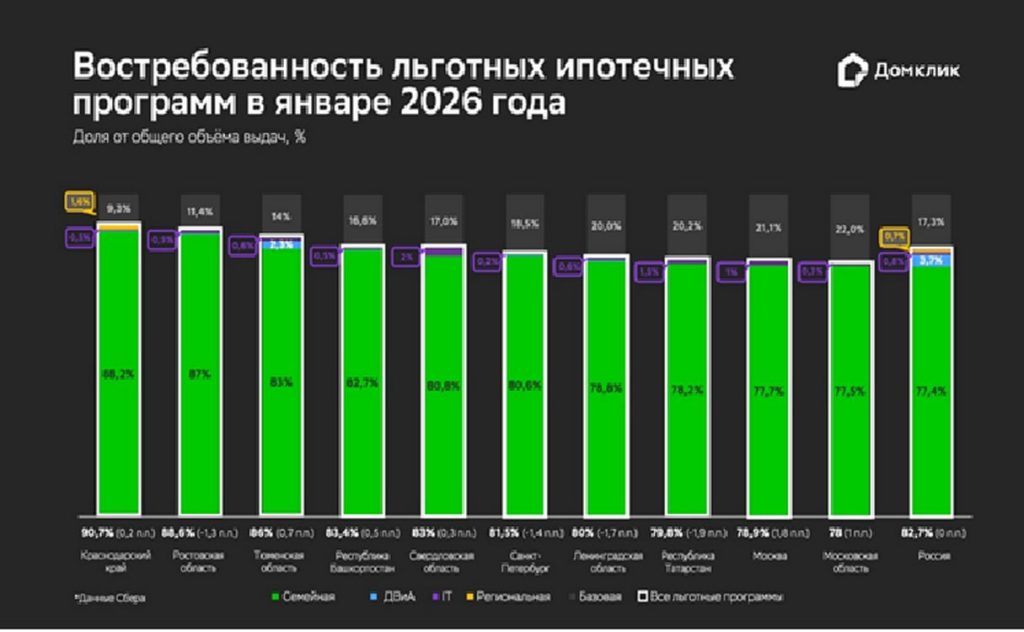В январе 2026 наиболее значительная доля «Семейной ипотеки» в выдачах пришлась на Астраханскую область (89,7%), Краснодарский край (88,2%) и Ростовскую область (87%).